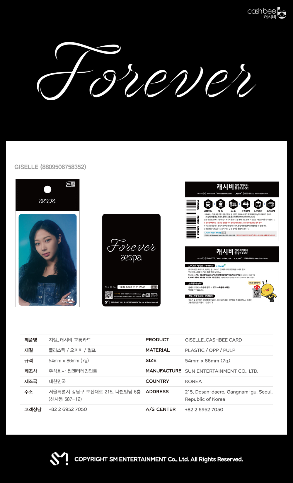 상세내역운영방침리뷰NOTICE* 아웃박스는 상품 보호를 위한 충격 방지용으로 제작되어 스크래치 및 구겨짐, 변색 등이 포장/배송 과정에서 생겨날 수 있고 이는 교환 사유가 될 수 없습니다.aespa Traffic Card (GISELLE Ver.) PART * The outer case is just for protecting goods. (scratches and discoloration on the case can not be the reason for exchanging or returning * 제품사양 - 교통카드 : 54 x 85mm - 리플렛(안내장) : 54 x 86mm - OPP 비닐 : 62 x 120mm INFORMATION 상품 정보 제공 고시상품명 : aespa - 교통카드 (지젤 버전)원산지 : Korea제조/수입 : (주)썬엔터테인먼트 (주)썬엔터테인먼트품질보증기준 : 관련법 및 소비자 분쟁 해결규정에 따름.AS 책임자 연락처 : Ktown4u, 02-552-0978