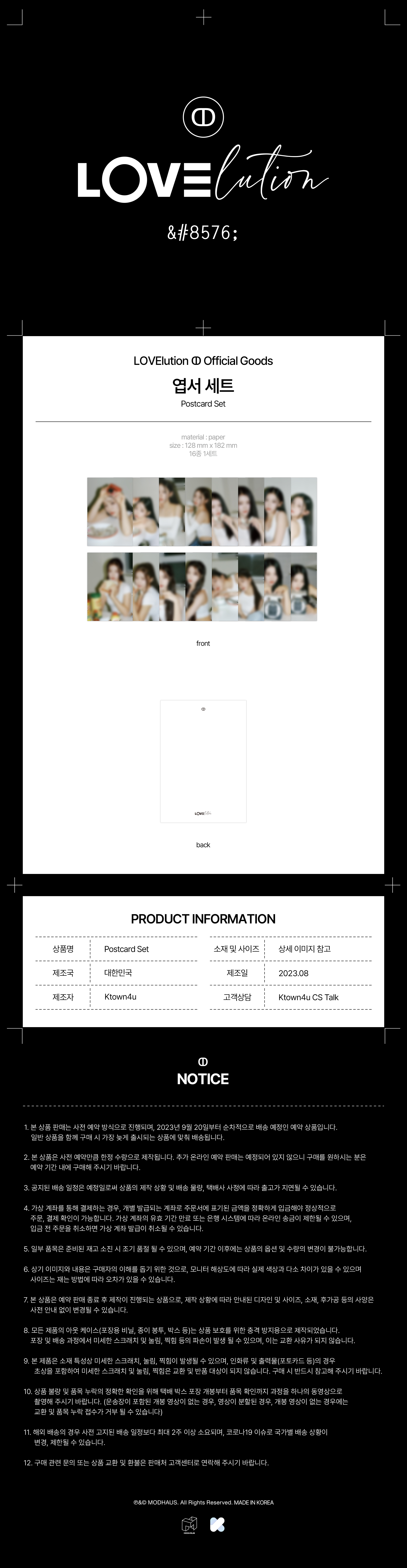 상세내역운영방침리뷰NOTICE* 아웃박스는 상품 보호를 위한 충격 방지용으로 제작되어 스크래치 및 구겨짐, 변색 등이 포장/배송 과정에서 생겨날 수 있고 이는 교환 사유가 될 수 없습니다.tripleS POSTCARD SET [LOVElution] PART INFORMATION 상품 정보 제공 고시상품명 : 트리플에스(tripleS) - 엽서 세트 [LOVElution]원산지 : Korea제조/수입 : 주식회사 케이타운포유 주식회사 케이타운포유품질보증기준 : 관련법 및 소비자 분쟁 해결규정에 따름.AS 책임자 연락처 : Ktown4u, 02-552-0978