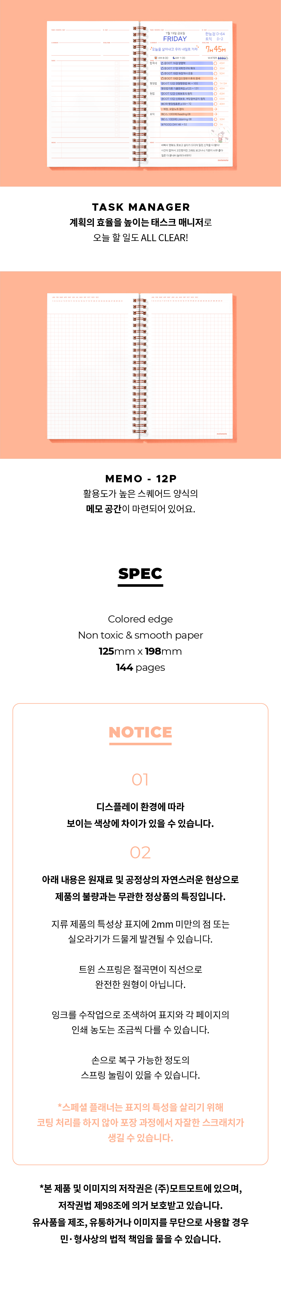 상세내역운영방침리뷰NOTICE* 아웃박스는 상품 보호를 위한 충격 방지용으로 제작되어 스크래치 및 구겨짐, 변색 등이 포장/배송 과정에서 생겨날 수 있고 이는 교환 사유가 될 수 없습니다.task manager for 100days_shine peach 상품 정보 제공 고시상품명 : [모트모트] 태스크 매니저 100DAYS_샤인피치원산지 : Korea제조/수입 : 모트모트 모트모트품질보증기준 : 관련법 및 소비자 분쟁 해결규정에 따름.AS 책임자 연락처 : Ktown4u, 02-552-0978