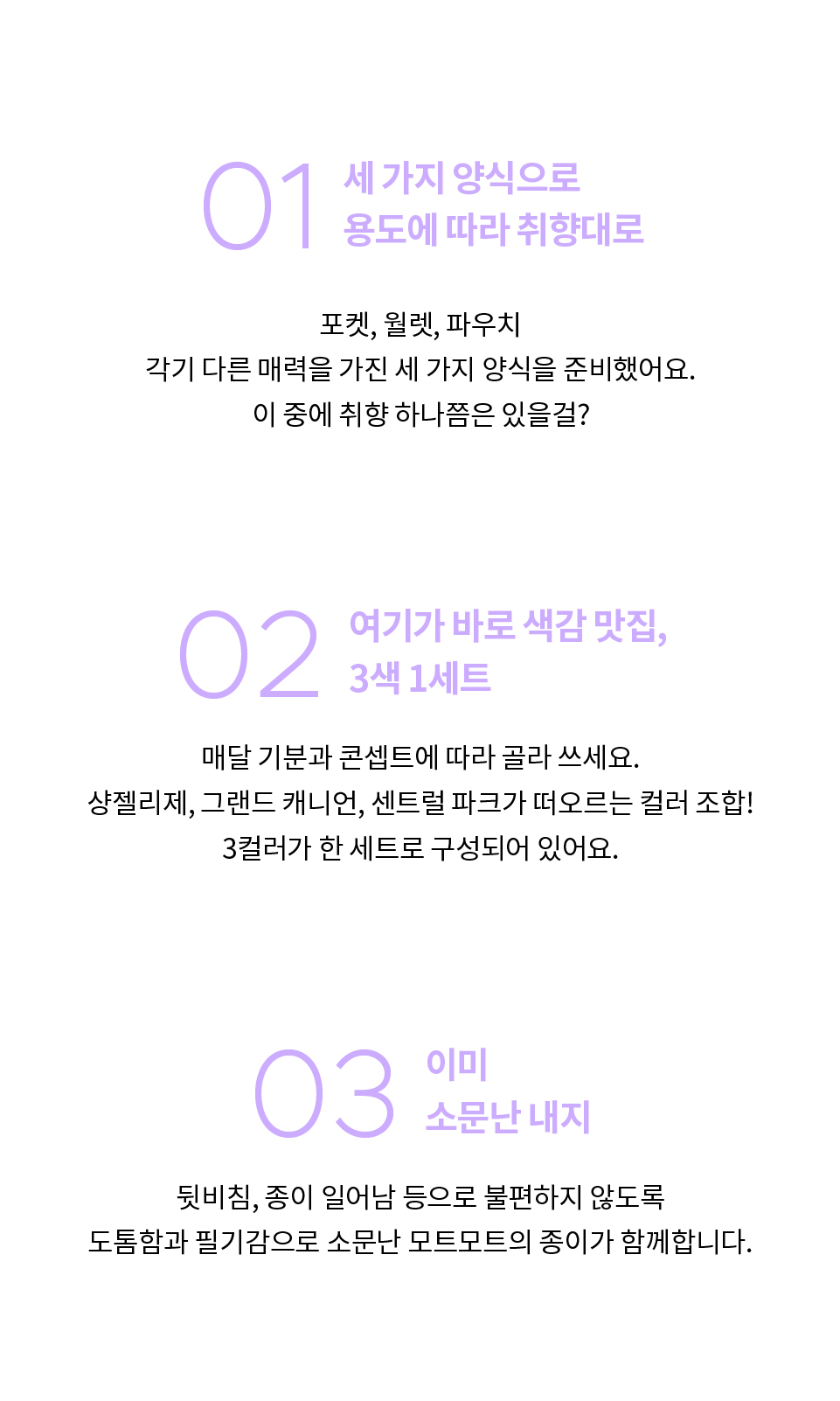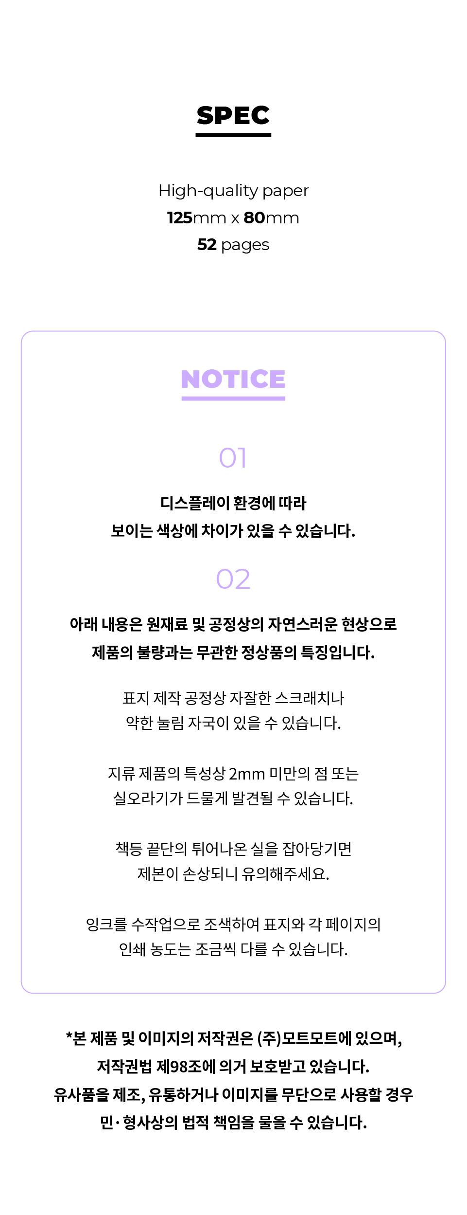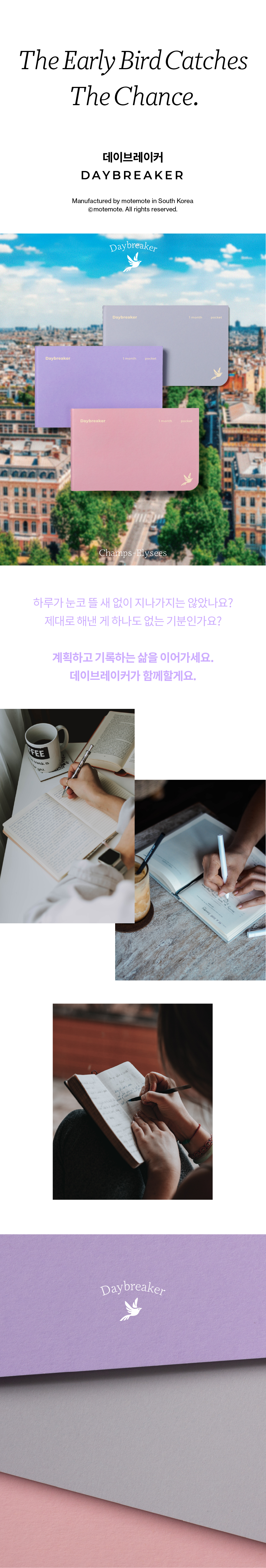 상세내역운영방침리뷰NOTICE* 아웃박스는 상품 보호를 위한 충격 방지용으로 제작되어 스크래치 및 구겨짐, 변색 등이 포장/배송 과정에서 생겨날 수 있고 이는 교환 사유가 될 수 없습니다.daybreaker_S pocket_Champs Elysees(3EA) 상품 정보 제공 고시상품명 : [모트모트] 데이브레이커_S포켓_샹젤리제(3EA)원산지 : Korea제조/수입 : 모트모트 모트모트품질보증기준 : 관련법 및 소비자 분쟁 해결규정에 따름.AS 책임자 연락처 : Ktown4u, 02-552-0978