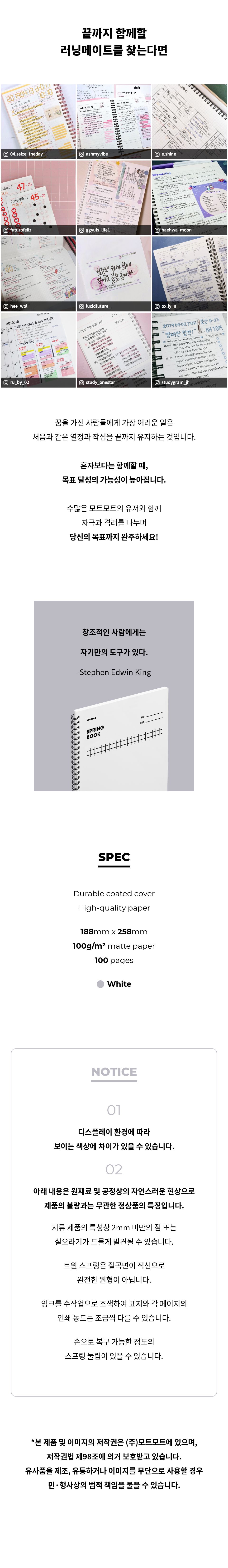 상세내역운영방침리뷰NOTICE* 아웃박스는 상품 보호를 위한 충격 방지용으로 제작되어 스크래치 및 구겨짐, 변색 등이 포장/배송 과정에서 생겨날 수 있고 이는 교환 사유가 될 수 없습니다.spring book_white(3type) 상품 정보 제공 고시상품명 : [모트모트] 스프링북_화이트(3type)원산지 : Korea제조/수입 : 모트모트 모트모트품질보증기준 : 관련법 및 소비자 분쟁 해결규정에 따름.AS 책임자 연락처 : Ktown4u, 02-552-0978