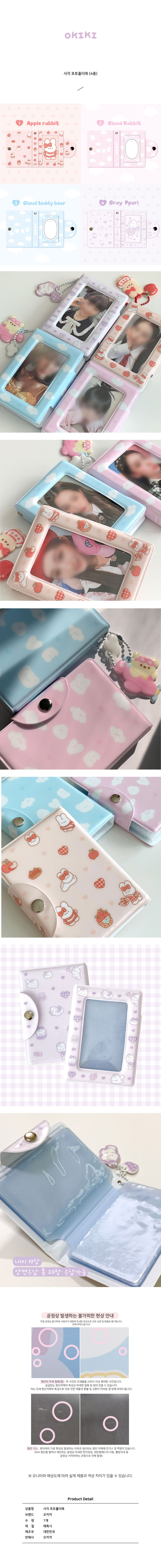 상세내역운영방침리뷰NOTICE* 아웃박스는 상품 보호를 위한 충격 방지용으로 제작되어 스크래치 및 구겨짐, 변색 등이 포장/배송 과정에서 생겨날 수 있고 이는 교환 사유가 될 수 없습니다.OKIKI photo holder book (apple rabbit / cloud rabbit / cloud teddy bear / gray ppori) PART [콜렉트북 주의사항] 인쇄물(겉면,내지) 인쇄밀림,미세얼룩,작은점,찍힘 안내 공급받고 있는 인쇄원단의 경우 미세한 얼룩 및 점이 있을 수 있습니다! 인쇄 원단자체의 특성으로 이로 인한 제품의 환불이나 교환이 어려운 점 양해부탁드립니다. 콜렉트북 원단은 낮은 온도에 약해서 받은 즉시 개봉하면 깨질 위험이 있어요! 실온에 10분정도 보관 후 열어주세요! (눌림,찍힌 부분은 드라이기로 살짝 열을 가해주면 복구됩니다. 참고해주세요) INFORMATION 상품 정보 제공 고시상품명 : 오키키 포토홀더북 (4type)원산지 : Korea제조/수입 : 오키키 오키키품질보증기준 : 관련법 및 소비자 분쟁 해결규정에 따름.AS 책임자 연락처 : Ktown4u, 02-552-0978