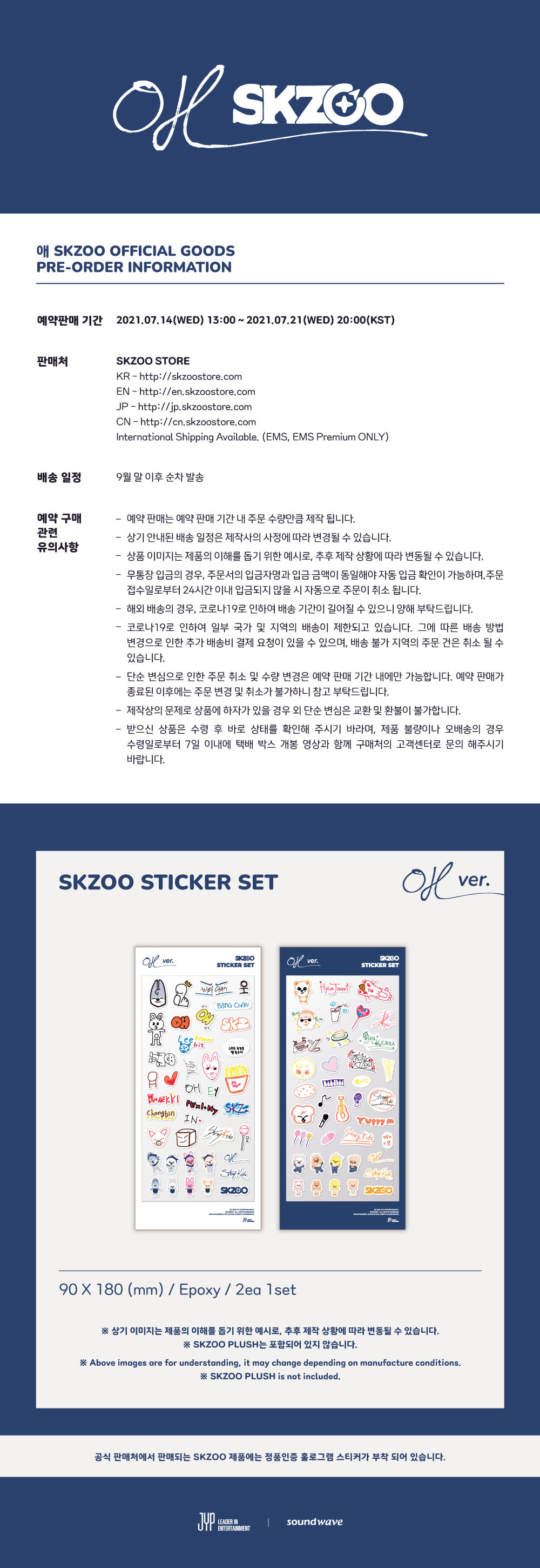 상세내역운영방침리뷰NOTICE* 아웃박스는 상품 보호를 위한 충격 방지용으로 제작되어 스크래치 및 구겨짐, 변색 등이 포장/배송 과정에서 생겨날 수 있고 이는 교환 사유가 될 수 없습니다.[애 SKZOO] Sticker Set PART * The outer case is just for protecting goods. (scratches and discoloration on the case can not be the reason for exchanging or returning) INFORMATION 상품 정보 제공 고시상품명 : [애 SKZOO] 스티커 세트원산지 : Korea제조/수입 : JYP Entertainment 사운드웨이브품질보증기준 : 관련법 및 소비자 분쟁 해결규정에 따름.AS 책임자 연락처 : Ktown4u, 02-552-0978