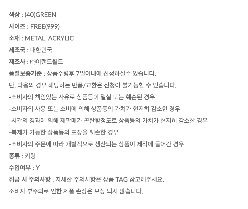상세내역운영방침리뷰NOTICE* 아웃박스는 상품 보호를 위한 충격 방지용으로 제작되어 스크래치 및 구겨짐, 변색 등이 포장/배송 과정에서 생겨날 수 있고 이는 교환 사유가 될 수 없습니다.[SPAO] [Tokyo Revengers] Keyring (Green) PART INFORMATION 상품 정보 제공 고시상품명 : [SPAO] [도쿄리벤저스] 키링(GREEN)원산지 : Korea제조/수입 : (주)이랜드월드패션사업부 품질보증기준 : 관련법 및 소비자 분쟁 해결규정에 따름.AS 책임자 연락처 : Ktown4u, 02-552-0978