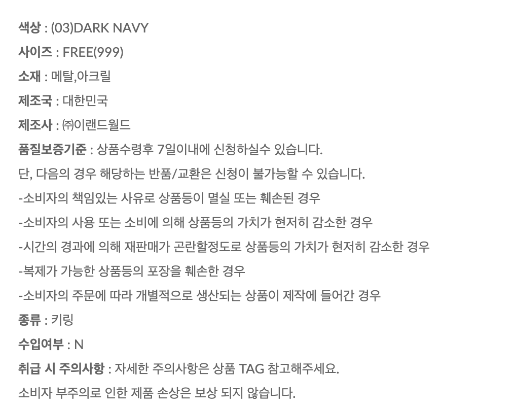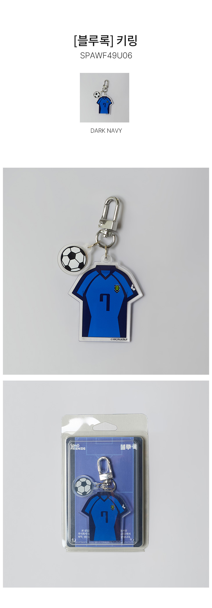 상세내역운영방침리뷰NOTICE* 아웃박스는 상품 보호를 위한 충격 방지용으로 제작되어 스크래치 및 구겨짐, 변색 등이 포장/배송 과정에서 생겨날 수 있고 이는 교환 사유가 될 수 없습니다.[SPAO] [Blue Lock] Keyring (Dark Navy) PART INFORMATION 상품 정보 제공 고시상품명 : [SPAO] [블루록] 키링(DARK NAVY)원산지 : Korea제조/수입 : (주)이랜드월드패션사업부 품질보증기준 : 관련법 및 소비자 분쟁 해결규정에 따름.AS 책임자 연락처 : Ktown4u, 02-552-0978