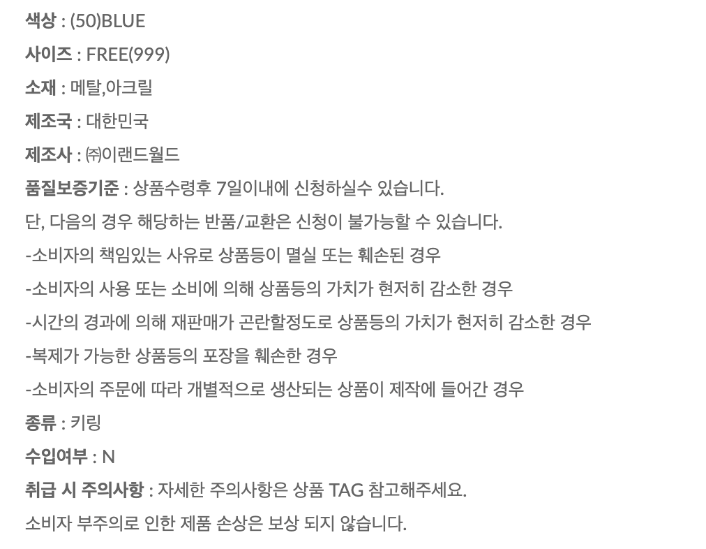 상세내역운영방침리뷰NOTICE* 아웃박스는 상품 보호를 위한 충격 방지용으로 제작되어 스크래치 및 구겨짐, 변색 등이 포장/배송 과정에서 생겨날 수 있고 이는 교환 사유가 될 수 없습니다.[SPAO] [Blue Lock] Keyring (Blue) PART INFORMATION 상품 정보 제공 고시상품명 : [SPAO] [블루록] 키링(BLUE)원산지 : Korea제조/수입 : (주)이랜드월드패션사업부 품질보증기준 : 관련법 및 소비자 분쟁 해결규정에 따름.AS 책임자 연락처 : Ktown4u, 02-552-0978