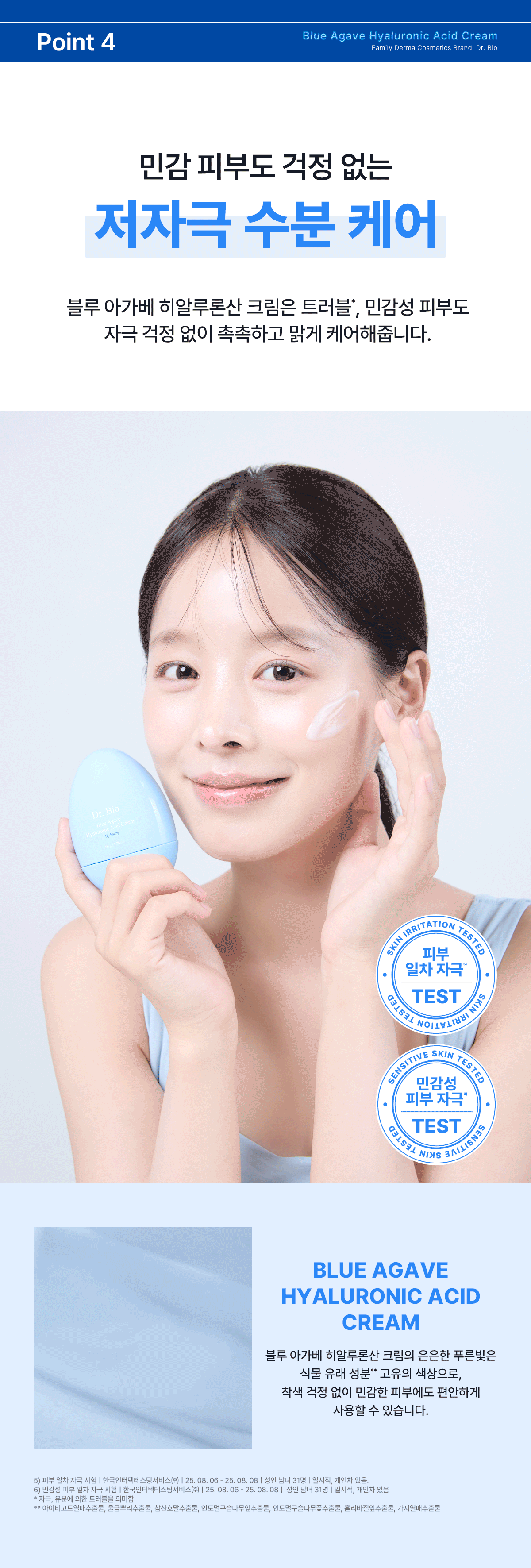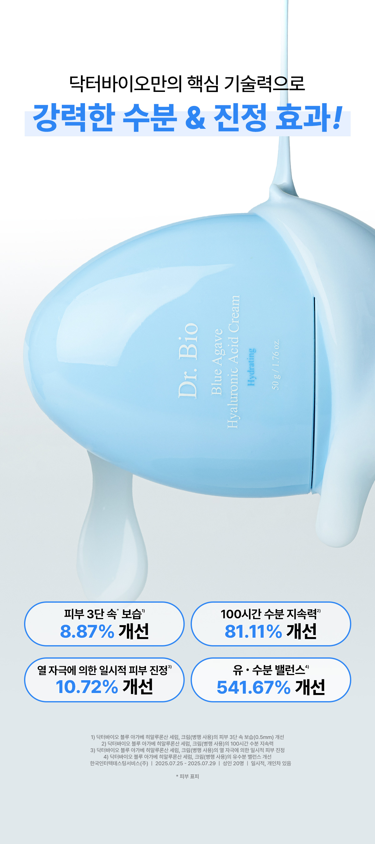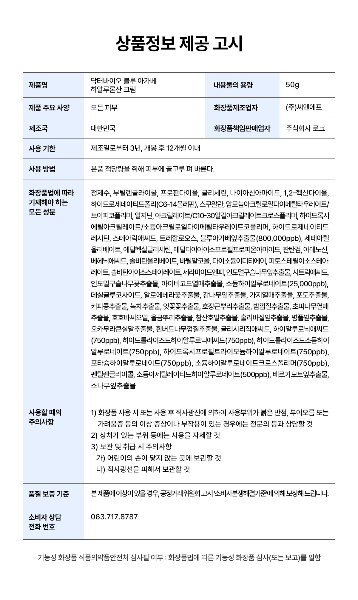 상세내역운영방침리뷰NOTICE* 아웃박스는 상품 보호를 위한 충격 방지용으로 제작되어 스크래치 및 구겨짐, 변색 등이 포장/배송 과정에서 생겨날 수 있고 이는 교환 사유가 될 수 없습니다.[Dr.Bio] Blue Agave Hyaluronic Acid Cream 50g PART INFORMATION 상품 정보 제공 고시상품명 : [닥터바이오] 블루아가베 히알루론산 크림 50g원산지 : Korea제조/수입 : 씨엔에프 품질보증기준 : 관련법 및 소비자 분쟁 해결규정에 따름.AS 책임자 연락처 : Ktown4u, 02-552-0978