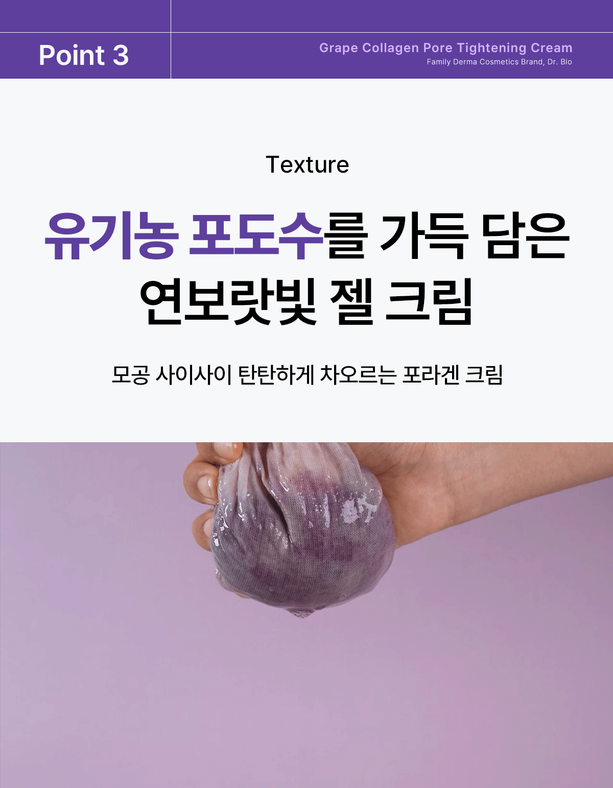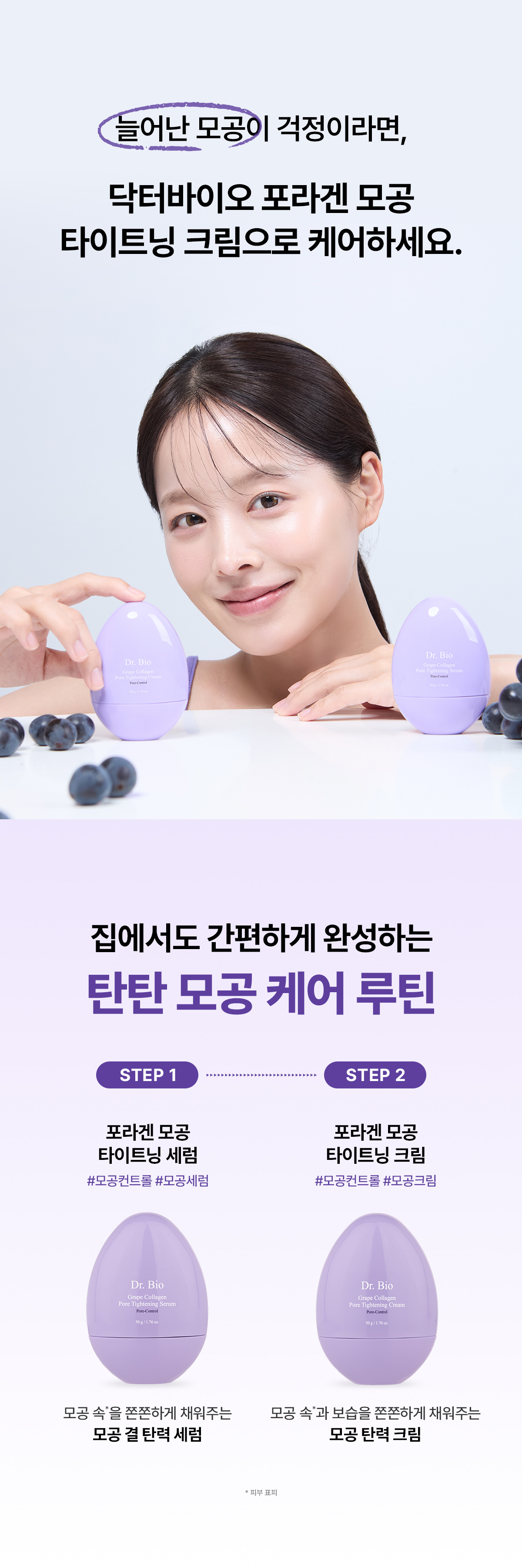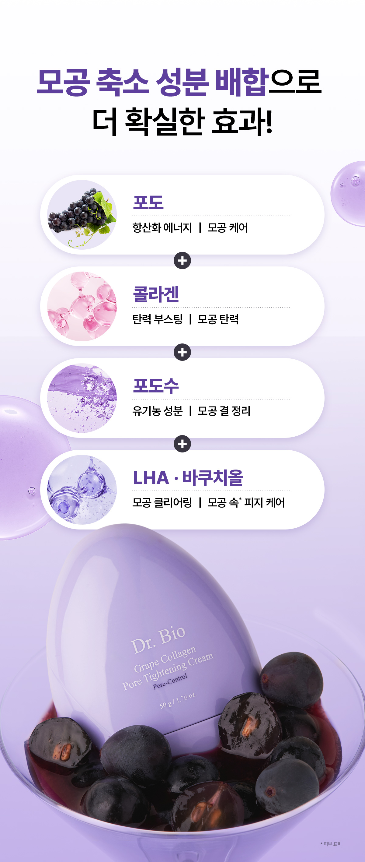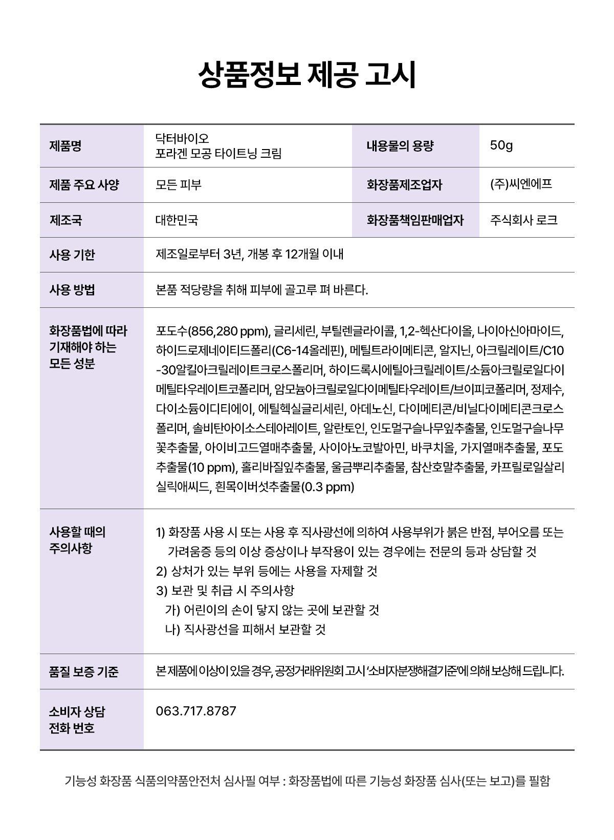 상세내역운영방침리뷰NOTICE* 아웃박스는 상품 보호를 위한 충격 방지용으로 제작되어 스크래치 및 구겨짐, 변색 등이 포장/배송 과정에서 생겨날 수 있고 이는 교환 사유가 될 수 없습니다.[Dr.Bio] Grape Collagen Pore Tightening Cream 50g PART INFORMATION 상품 정보 제공 고시상품명 : [닥터바이오] 포라겐 모공 타이트닝 크림 50g원산지 : Korea제조/수입 : 씨엔에프 품질보증기준 : 관련법 및 소비자 분쟁 해결규정에 따름.AS 책임자 연락처 : Ktown4u, 02-552-0978