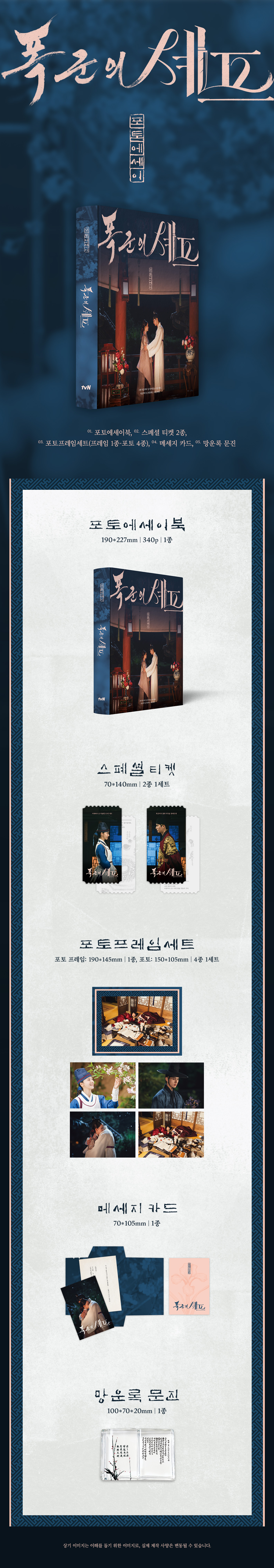 상세내역운영방침리뷰NOTICE* 아웃박스는 상품 보호를 위한 충격 방지용으로 제작되어 스크래치 및 구겨짐, 변색 등이 포장/배송 과정에서 생겨날 수 있고 이는 교환 사유가 될 수 없습니다.[Photo Essay] Bon Appétit, Your Majesty - tvN Drama PART INFORMATION 상품 정보 제공 고시상품명 : [포토에세이] 폭군의 셰프 - tvN 드라마원산지 : Korea제조/수입 : (주)코팬글로벌품질보증기준 : 관련법 및 소비자 분쟁 해결규정에 따름.AS 책임자 연락처 : Ktown4u, 02-552-0978