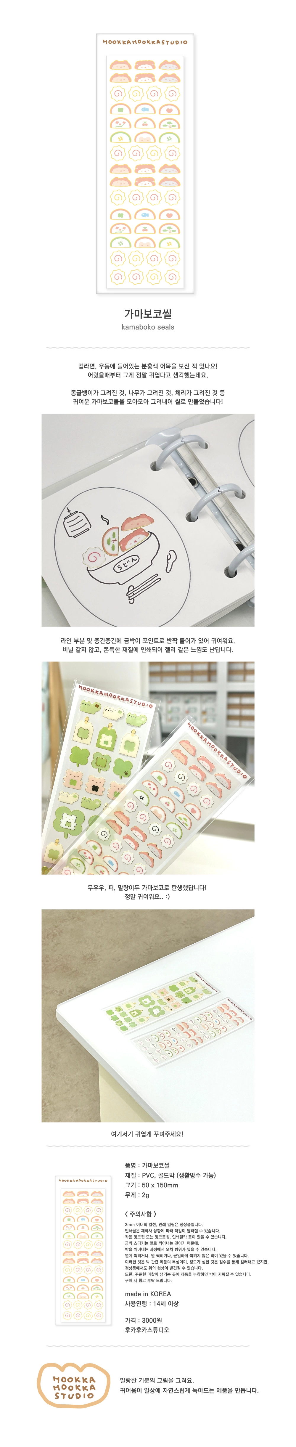 상세내역운영방침리뷰NOTICE* 아웃박스는 상품 보호를 위한 충격 방지용으로 제작되어 스크래치 및 구겨짐, 변색 등이 포장/배송 과정에서 생겨날 수 있고 이는 교환 사유가 될 수 없습니다.[HOOKKA HOOKKA STUDIO] Kamaboko Seal Sticker PART INFORMATION 상품 정보 제공 고시상품명 : [후카후카스튜디오] 가마보코씰원산지 : Korea제조/수입 : 주식회사 유오코 품질보증기준 : 관련법 및 소비자 분쟁 해결규정에 따름.AS 책임자 연락처 : Ktown4u, 02-552-0978