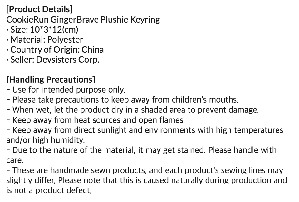상세내역운영방침리뷰NOTICE* 아웃박스는 상품 보호를 위한 충격 방지용으로 제작되어 스크래치 및 구겨짐, 변색 등이 포장/배송 과정에서 생겨날 수 있고 이는 교환 사유가 될 수 없습니다.[CookieRun] GingerBrave Plushie Keyring PART INFORMATION 상품 정보 제공 고시상품명 : [쿠키런] 용감한 쿠키 인형 키링원산지 : China제조/수입 : 오로라월드㈜ 품질보증기준 : 관련법 및 소비자 분쟁 해결규정에 따름.AS 책임자 연락처 : Ktown4u, 02-552-0978