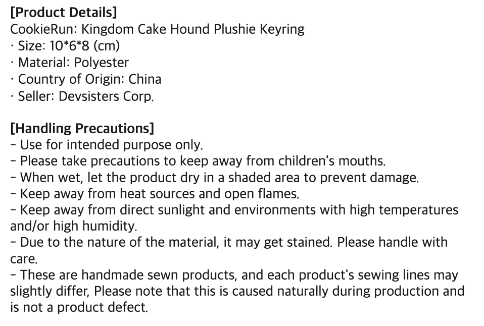 상세내역운영방침리뷰NOTICE* 아웃박스는 상품 보호를 위한 충격 방지용으로 제작되어 스크래치 및 구겨짐, 변색 등이 포장/배송 과정에서 생겨날 수 있고 이는 교환 사유가 될 수 없습니다.[CookieRun] Kingdom Cake Hound Plushie Keyring PART INFORMATION 상품 정보 제공 고시상품명 : [쿠키런] 케이크 들개 인형 키링원산지 : China제조/수입 : 오로라월드㈜ 품질보증기준 : 관련법 및 소비자 분쟁 해결규정에 따름.AS 책임자 연락처 : Ktown4u, 02-552-0978