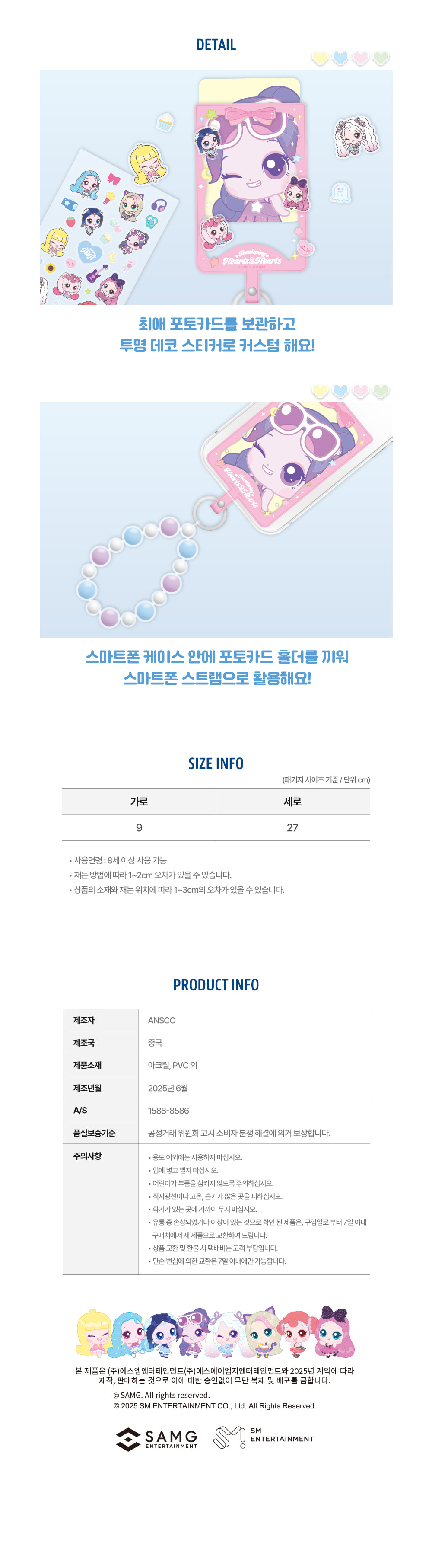 상세내역운영방침리뷰NOTICE* 아웃박스는 상품 보호를 위한 충격 방지용으로 제작되어 스크래치 및 구겨짐, 변색 등이 포장/배송 과정에서 생겨날 수 있고 이는 교환 사유가 될 수 없습니다.[Teenieping] H2H Photocard Phone Strap PART INFORMATION 상품 정보 제공 고시상품명 : [티니핑] H2H 포토카드 폰 스트랩원산지 : China제조/수입 : ANSCO 품질보증기준 : 관련법 및 소비자 분쟁 해결규정에 따름.AS 책임자 연락처 : Ktown4u, 02-552-0978
