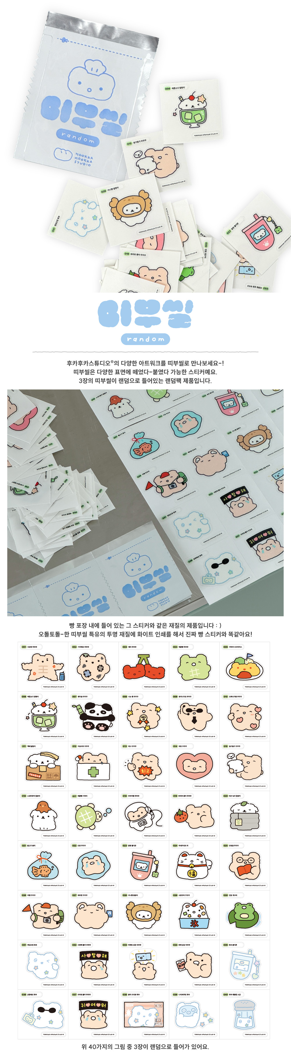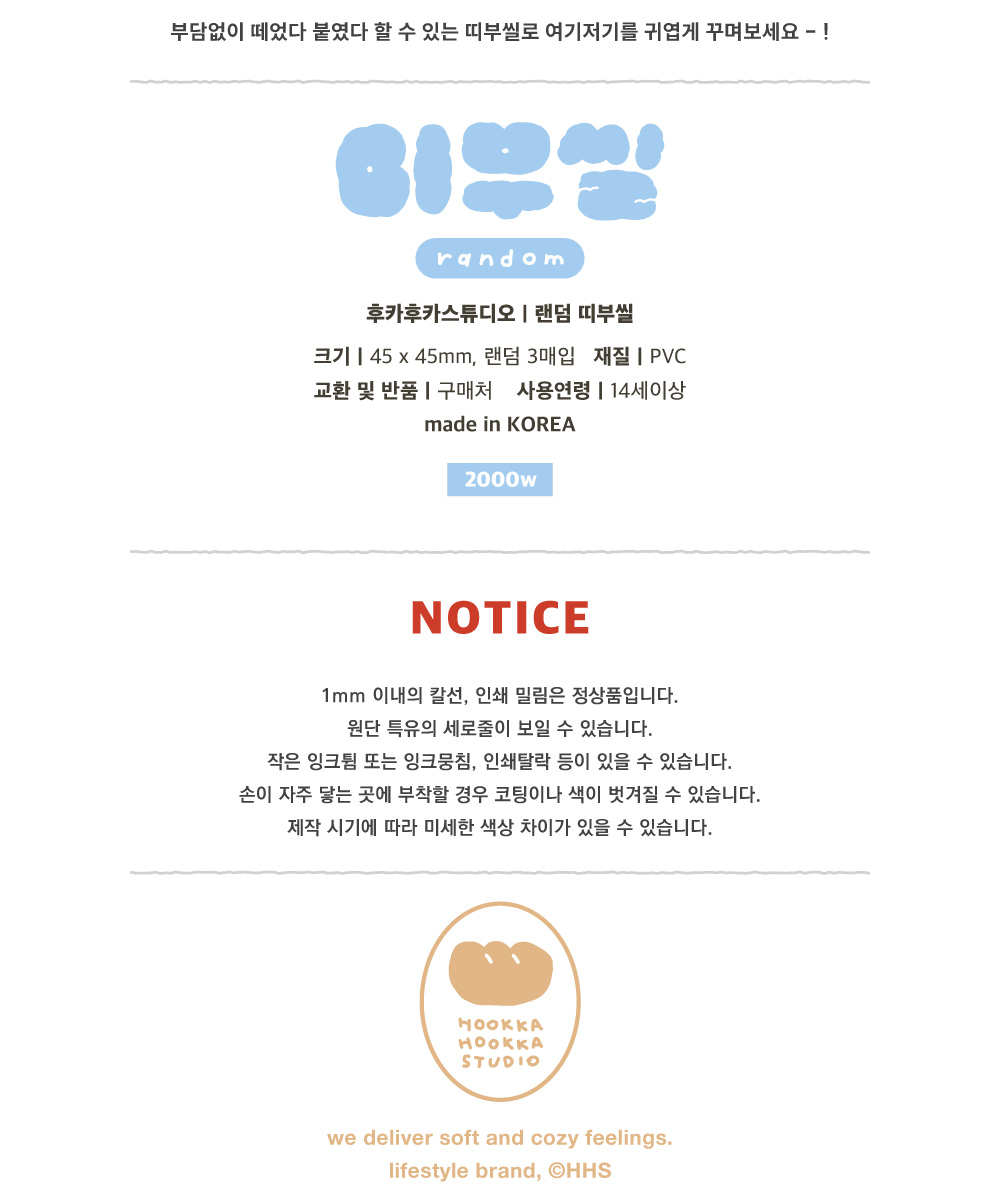 상세내역운영방침리뷰NOTICE* 아웃박스는 상품 보호를 위한 충격 방지용으로 제작되어 스크래치 및 구겨짐, 변색 등이 포장/배송 과정에서 생겨날 수 있고 이는 교환 사유가 될 수 없습니다.[HOOKKA HOOKKA STUDIO] Random Sticker Seal PART INFORMATION 상품 정보 제공 고시상품명 : [후카후카스튜디오] 랜덤 띠부씰원산지 : Korea제조/수입 : 주식회사 유오코 품질보증기준 : 관련법 및 소비자 분쟁 해결규정에 따름.AS 책임자 연락처 : Ktown4u, 02-552-0978