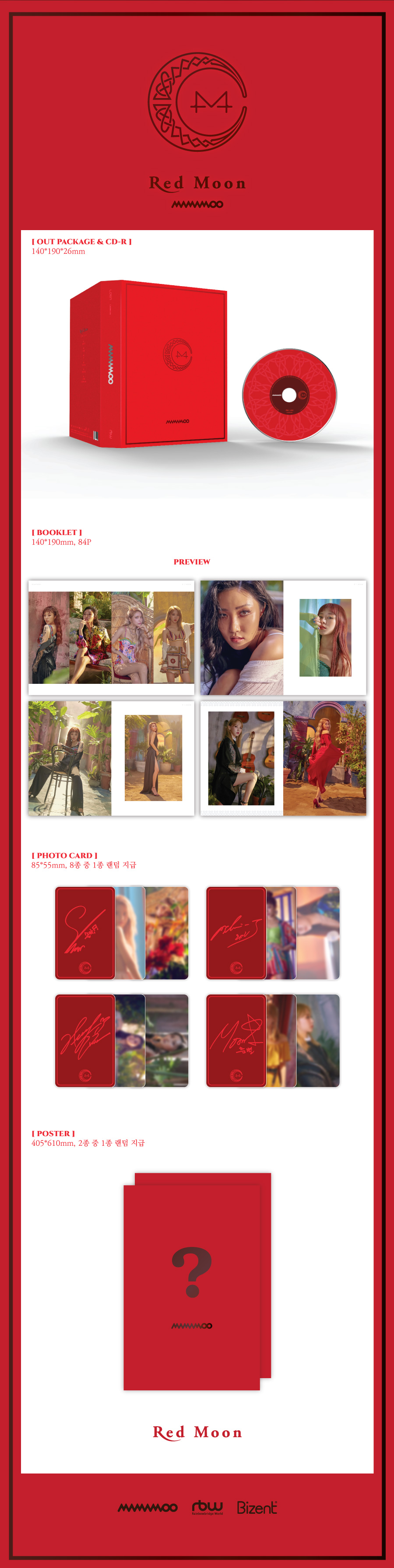 올해 3월 [Yellow Flower]의 타이틀곡 <별이 빛나는 밤>을 통해 각종 차트를 휩쓸며 ‘포시즌 포컬러 프로젝트’의 성공적인 항해를 시작한 마마무. 네 가지 컬러에 각각의 상징으로 지금까지 보여주지 못한 각 멤버들의 숨겨진 매력과 역량을 담아내는 이 프로젝트에서 두 번째로 문별의 ‘RED’를 앞세운 새 미니앨범 [RED MOON]을 발매했다. [RED MOON]은 마마무의 두 번째 컬러인 빨간색에 문별을 뜻하는 문(달)을 합한 것으로, 여름과 닮은 마마무의 정열적인 매력을 쏟아내며 무더운 여름을 더욱 뜨겁게 달굴 예정이다.