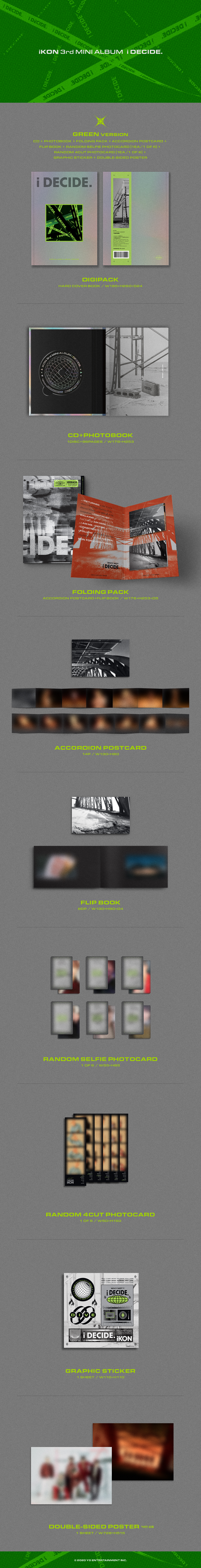 iKON 3rd MINI ALBUM [i DECIDE]는, 버전별 이미지가 상이한 [RED Ver.], [GREEN Ver.] 총 2종으로 발매되며 오는 1월 30일부터 예약판매를 시작하여 2월 7일 YG셀렉트를 비롯 전국 온/오프라인 음반 매장에서 만나볼 수 있다.