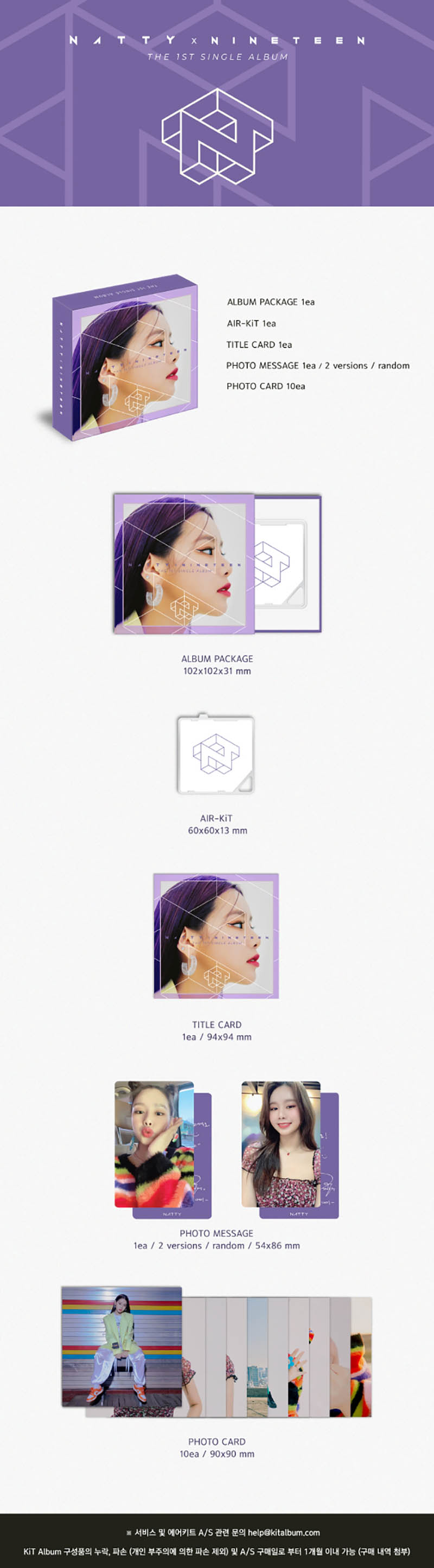 나띠의 데뷔 앨범 '나인틴'의 자켓이미지가 담긴 타이틀 카드, 나띠의 셀카와 손글씨로 쓰여진 포토 메세지, 19살 나띠의 다양한 모습을 볼 수 있는 포토 카드 등이 키트 앨범을 구성하고 있어 팬들의 소장 욕구를 자극하고 있다.