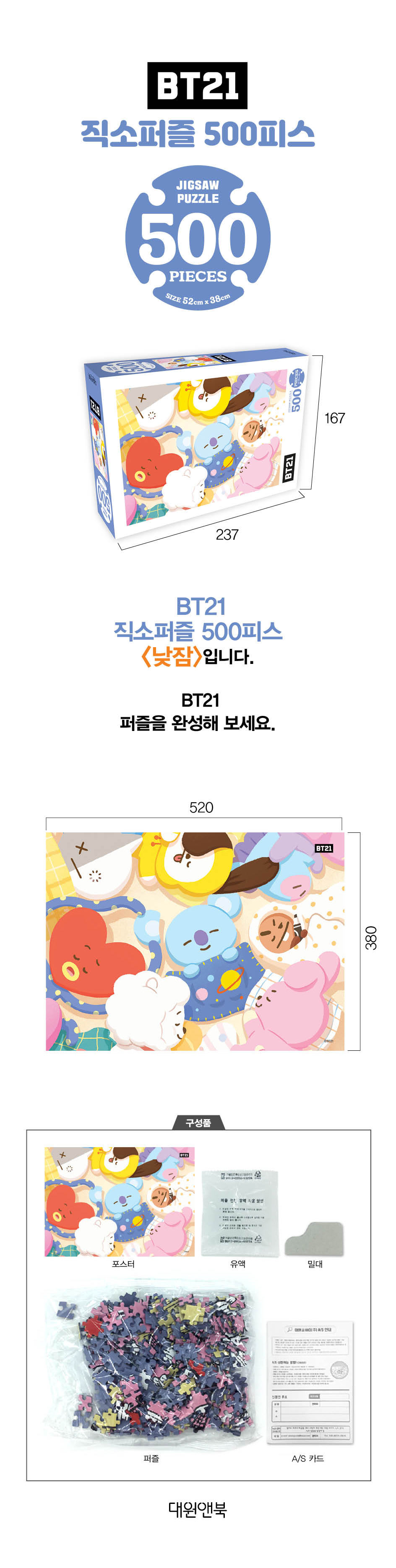 상세내역운영방침리뷰NOTICE* 아웃박스는 상품 보호를 위한 충격 방지용으로 제작되어 스크래치 및 구겨짐, 변색 등이 포장/배송 과정에서 생겨날 수 있고 이는 교환 사유가 될 수 없습니다.BTS 500piece Jigsaw Puzzle Naps PART * The outer case is just for protecting goods. (scratches and discoloration on the case can not be the reason for exchanging or returning) INFORMATION 상품 정보 제공 고시상품명 : [BT21] 500피스 직소퍼즐 낮잠원산지 : Korea제조/수입 : 대원앤북(대원씨아이) 품질보증기준 : 관련법 및 소비자 분쟁 해결규정에 따름.AS 책임자 연락처 : Ktown4u, 02-552-0978