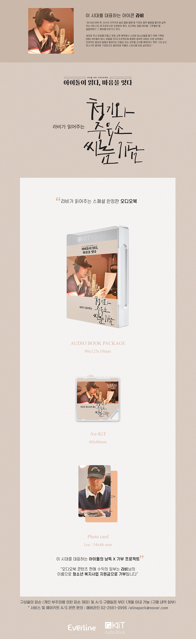 상세내역운영방침리뷰NOTICE* 아웃박스는 상품 보호를 위한 충격 방지용으로 제작되어 스크래치 및 구겨짐, 변색 등이 포장/배송 과정에서 생겨날 수 있고 이는 교환 사유가 될 수 없습니다.RAVI Kit Album [청기와주유소 씨름 기담] PART * The outer case is just for protecting goods. (scratches and discoloration on the case can not be the reason for exchanging or returning) - AUDIO BOOK PACKAGE - AIR KIT - PHOTOCARD : 1p INFORMATION 상품 정보 제공 고시상품명 : 라비 (RAVI) - 키트앨범 [청기와주유소 씨름 기담] (오디오 북)원산지 : Korea제조/수입 : 에버라인품질보증기준 : 관련법 및 소비자 분쟁 해결규정에 따름.AS 책임자 연락처 : Ktown4u, 02-552-0978