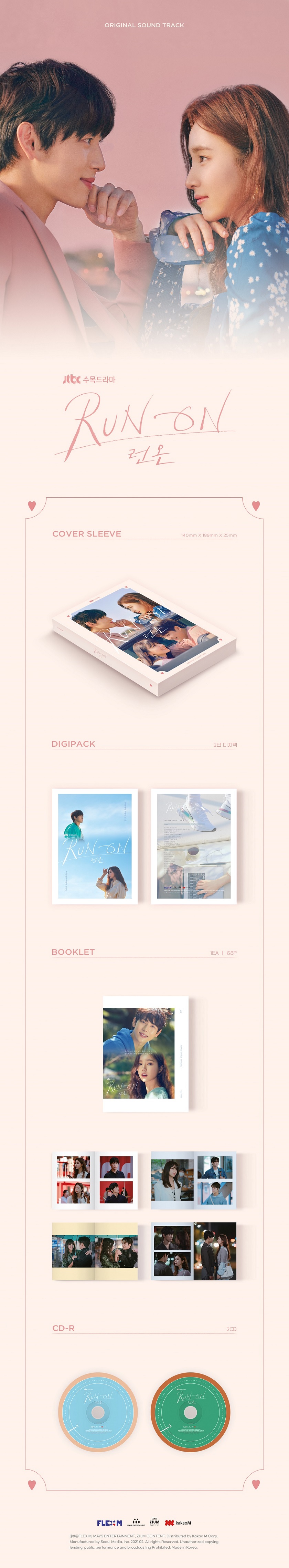 공개되는 곡마다 ‘명품 OST’라는 호평을 받아온 ‘런 온’ OST는 전체 트랙 음원 공개와 함께 2CD 및 포토북으로 구성된 음반도 발매된다. [CD 1]에는 주인공들의 감정선을 더욱 돋보이게 해준 OST 총 12트랙이 수록되었으며, [CD 2]에는 극의 분위기를 한층 더 살려준 BGM 총 13트랙이 수록되었다. 또한 포토북에는 드라마의 감동과 여운을 이어갈 배우들의 비하인드 컷들이 담겨 ‘런 온’ 팬들에게 더욱 소장 가치가 높은 앨범이 될 것이다.