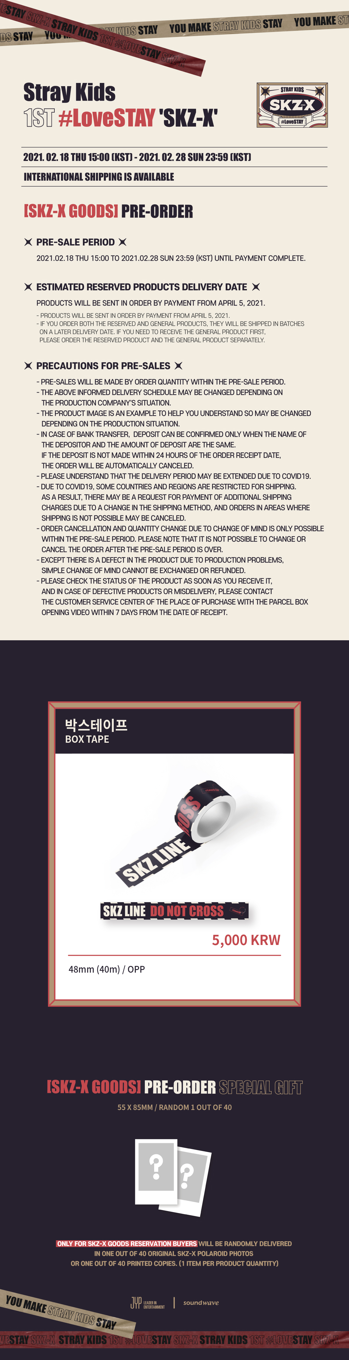 상세내역운영방침리뷰NOTICE* 아웃박스는 상품 보호를 위한 충격 방지용으로 제작되어 스크래치 및 구겨짐, 변색 등이 포장/배송 과정에서 생겨날 수 있고 이는 교환 사유가 될 수 없습니다.STRAY KIDS BOX TAPE [1ST #LoveSTAY SKZ-X] PART * The outer case is just for protecting goods. (scratches and discoloration on the case can not be the reason for exchanging or returning) INFORMATION 상품 정보 제공 고시상품명 : 스트레이 키즈 - 박스테이프 [1ST #LoveSTAY SKZ-X]원산지 : Korea제조/수입 : JYP Entertainment 사운드웨이브품질보증기준 : 관련법 및 소비자 분쟁 해결규정에 따름.AS 책임자 연락처 : Ktown4u, 02-552-0978