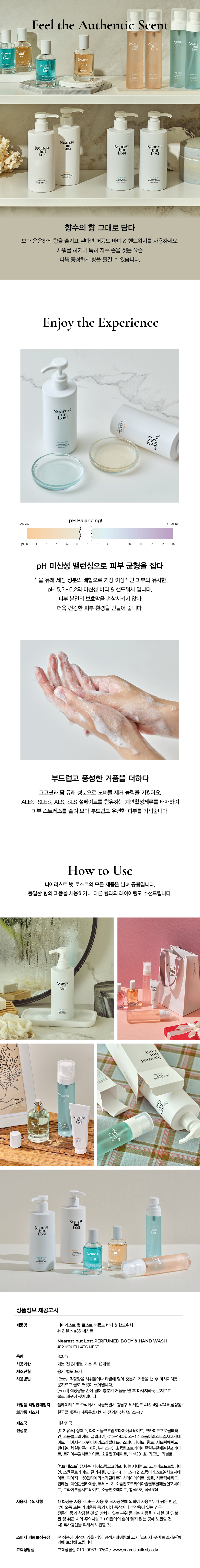 상세내역운영방침리뷰NOTICE* 아웃박스는 상품 보호를 위한 충격 방지용으로 제작되어 스크래치 및 구겨짐, 변색 등이 포장/배송 과정에서 생겨날 수 있고 이는 교환 사유가 될 수 없습니다. [Nearest but Lost] PERFUMED BODY & HAND WASH 300ml PART * The outer case is just for protecting goods. (scratches and discoloration on the case can not be the reason for exchanging or returning) #youth 香型:青柠,茉莉,琥珀 #nest 香型:依兰,薰衣草,麝香 INFORMATION 상품 정보 제공 고시상품명 : [니어리스트 벗 로스트] 퍼퓸드 바디&핸드워시 #36 NEST 300ml원산지 : Korea제조/수입 : 한국콜마(주) 플레이리스트(주)품질보증기준 : 관련법 및 소비자 분쟁 해결규정에 따름.AS 책임자 연락처 : Ktown4u, 02-552-0978