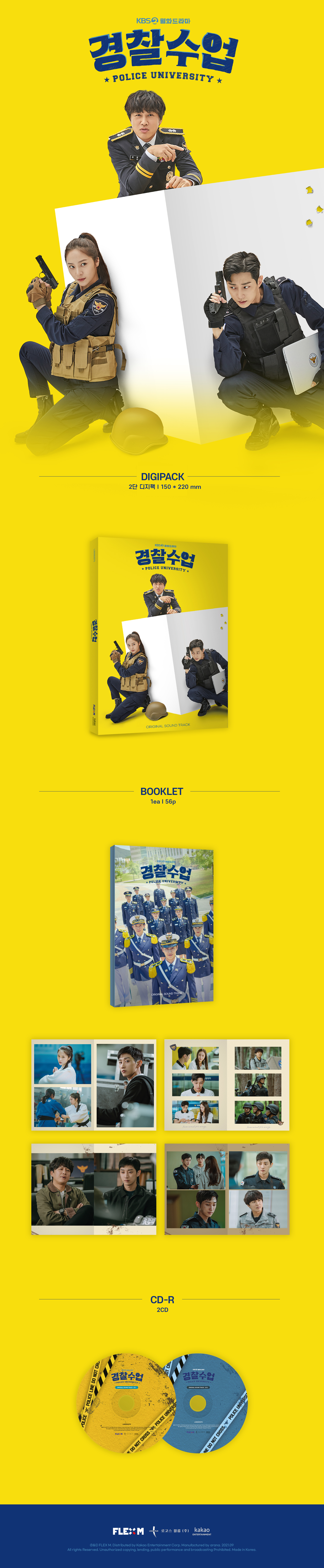 공개되는 곡마다 ‘명품 OST’라는 호평을 받아온 ‘경찰수업’ OST는 전체 트랙 음원 공개와 함께 2CD 및 포토북으로 구성된 음반도 발매된다. [CD 1]에는 주인공들의 스토리와 함께 감동을 선사한 아티스트들의 음원 14트랙이 수록되었으며, [CD 2]에는 극의 분위기를 한층 더 살려준 BGM 총 22트랙이 수록되었다. 또한 포토북에는 드라마의 감동과 여운을 이어갈 배우들의 비하인드 컷들이 담겨 ‘경찰수업’ 팬들에게 더욱 소장 가치가 높은 앨범이 될 것이다.