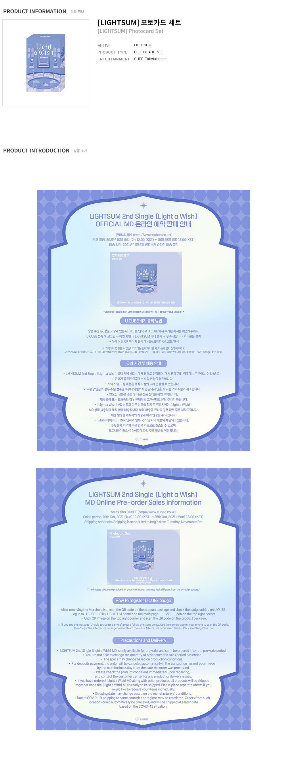 상세내역운영방침리뷰NOTICE* 아웃박스는 상품 보호를 위한 충격 방지용으로 제작되어 스크래치 및 구겨짐, 변색 등이 포장/배송 과정에서 생겨날 수 있고 이는 교환 사유가 될 수 없습니다.LIGHTSUM Photocard Set 상품 정보 제공 고시상품명 : 라잇썸 (LIGHTSUM) - 포토카드 세트원산지 : Korea제조/수입 : Cube Entertainment 품질보증기준 : 관련법 및 소비자 분쟁 해결규정에 따름.AS 책임자 연락처 : Ktown4u, 02-552-0978