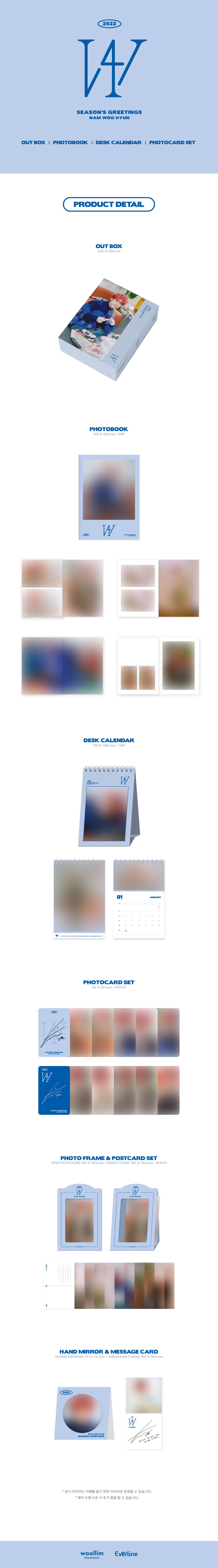 상세내역운영방침리뷰NOTICE* 아웃박스는 상품 보호를 위한 충격 방지용으로 제작되어 스크래치 및 구겨짐, 변색 등이 포장/배송 과정에서 생겨날 수 있고 이는 교환 사유가 될 수 없습니다.NAM WOO HYUN 2022 SEASON'S GREETINGS PART * The outer case is just for protecting goods. (scratches and discoloration on the case can not be the reason for exchanging or returning) 1. PHOTOBOOK 148*210mm / 68p 2. DESK CALENDAR 150*230mm / 28p 3. PHOTOCARD SET 55*85mm / 10pcs 4. PHOTO FRAME & POSTCARD SET PHOTO FRAME : 135*205mm / 1EA POSTCARD : 102*152mm / 10EA 5. HAND MIRROR & MESSAGE CARD HAND MIRROR : 75*75mm / 1EA POSTCARD : 100*100mm / 10EA *발매일은 변경될 수 있습니다. INFORMATION 상품 정보 제공 고시상품명 : 남우현 - 2022 시즌그리팅 원산지 : Korea제조/수입 : Woolim entertainment. 에버라인품질보증기준 : 관련법 및 소비자 분쟁 해결규정에 따름.AS 책임자 연락처 : Ktown4u, 02-552-0978
