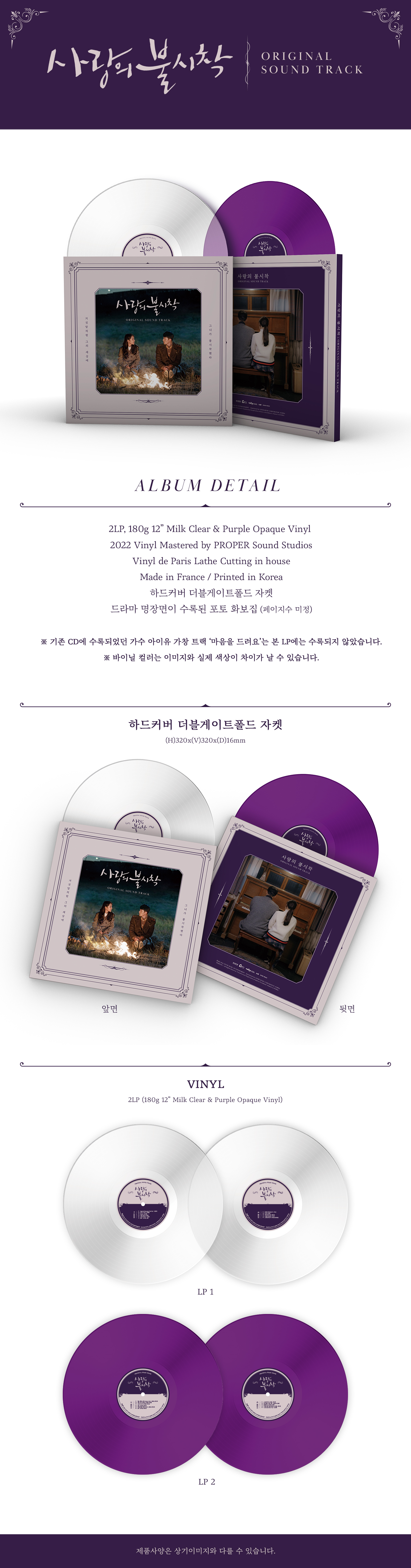 이번 ‘사랑의 불시착’ OST LP는 2장의 디스크에 총 22개 트랙으로 구성되며, ‘사랑의 불시착’ 오프닝 타이틀로 유명한 ‘시그리스빌’의 2개 버전 포함, 가창곡 12곡과 스코어 10곡을 담은 알찬 구성으로 만나 볼 수 있다.