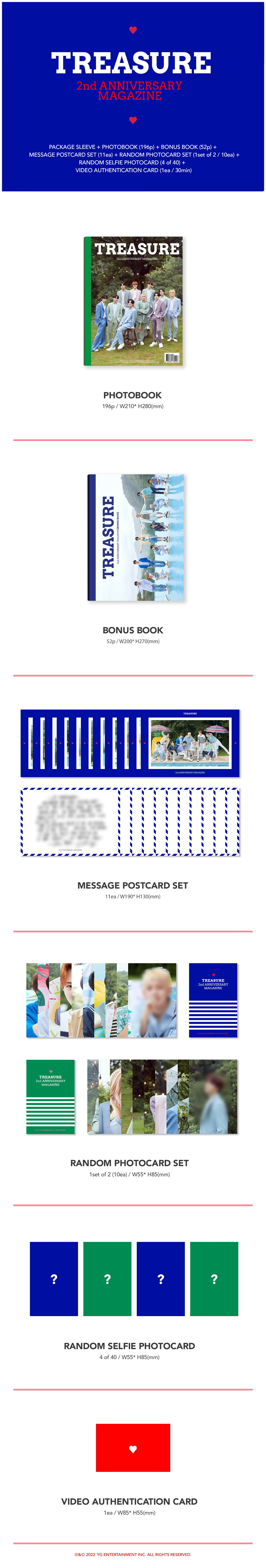 TREASURE 2nd ANNIVERSARY MAGAZINE은 트레저 멤버들의 청량하고 싱그러운 매력과 비오는 숲 속에서의 빛나는 캐미 등 다양한 모습을 담았다. 196페이지에 달하는 포토북, 폴라로이드 사진과 멤버들의 롤링페이퍼로 가득 채워진 보너스북, 트레저메이커에게 진심을 담아서 작성한 메시지가 담긴 포스트카드 세트, 랜덤 셀피 포토카드 뿐만 아니라 영상 인증카드를 통해 온라인에서 시청할 수 있는 포토북 사진 촬영 메이킹 영상과 무대 위가 아닌 일상 속 멤버들의 모습을 엿볼 수 있는 질문들로 구성된 서베이 영상 모두를 포함하여 소장가치를 높였다.