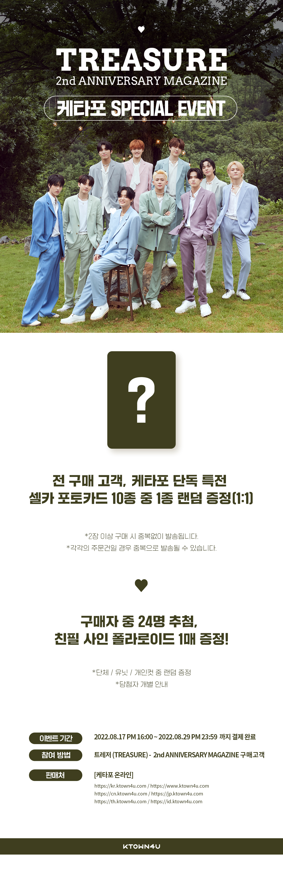 TREASURE 2nd ANNIVERSARY MAGAZINE은 8월 17일 예약판매를 시작하여 8월 30일 YG셀렉트, 케타포, 위버스샵을 비롯하여 전국 온/오프라인 음반 매장에서 만나볼 수 있다.
