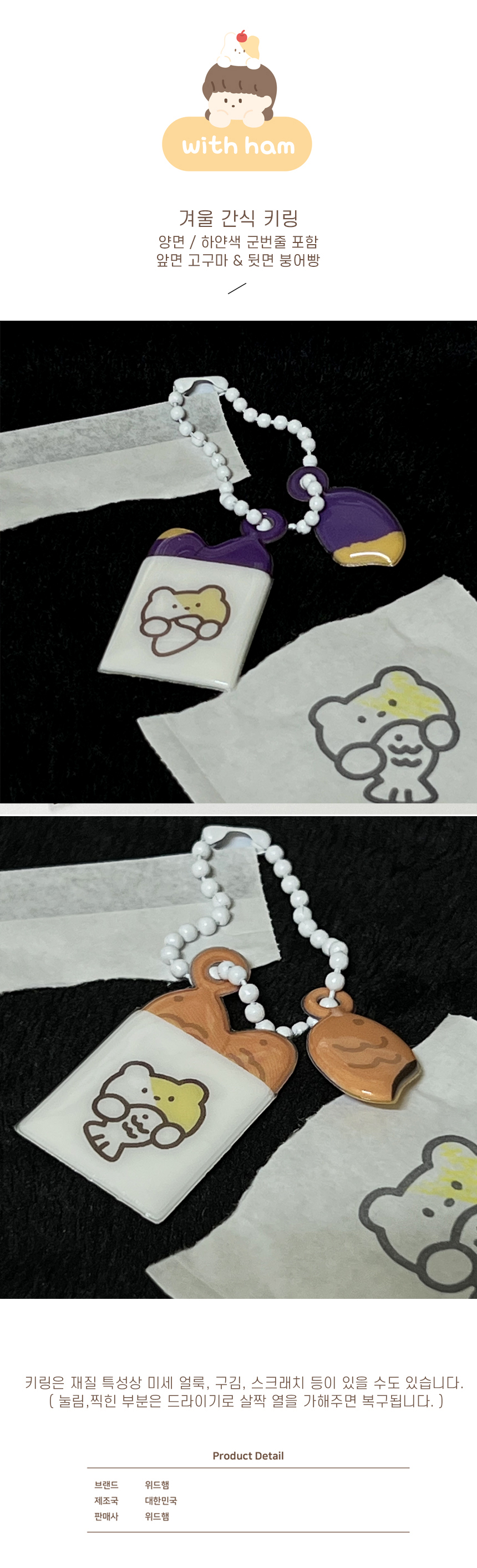 상세내역운영방침리뷰NOTICE* 아웃박스는 상품 보호를 위한 충격 방지용으로 제작되어 스크래치 및 구겨짐, 변색 등이 포장/배송 과정에서 생겨날 수 있고 이는 교환 사유가 될 수 없습니다.with ham Winter snack key ring 상품 정보 제공 고시상품명 : [위드햄] 겨울 간식 키링원산지 : Korea제조/수입 : 위드햄 위드햄품질보증기준 : 관련법 및 소비자 분쟁 해결규정에 따름.AS 책임자 연락처 : Ktown4u, 02-552-0978