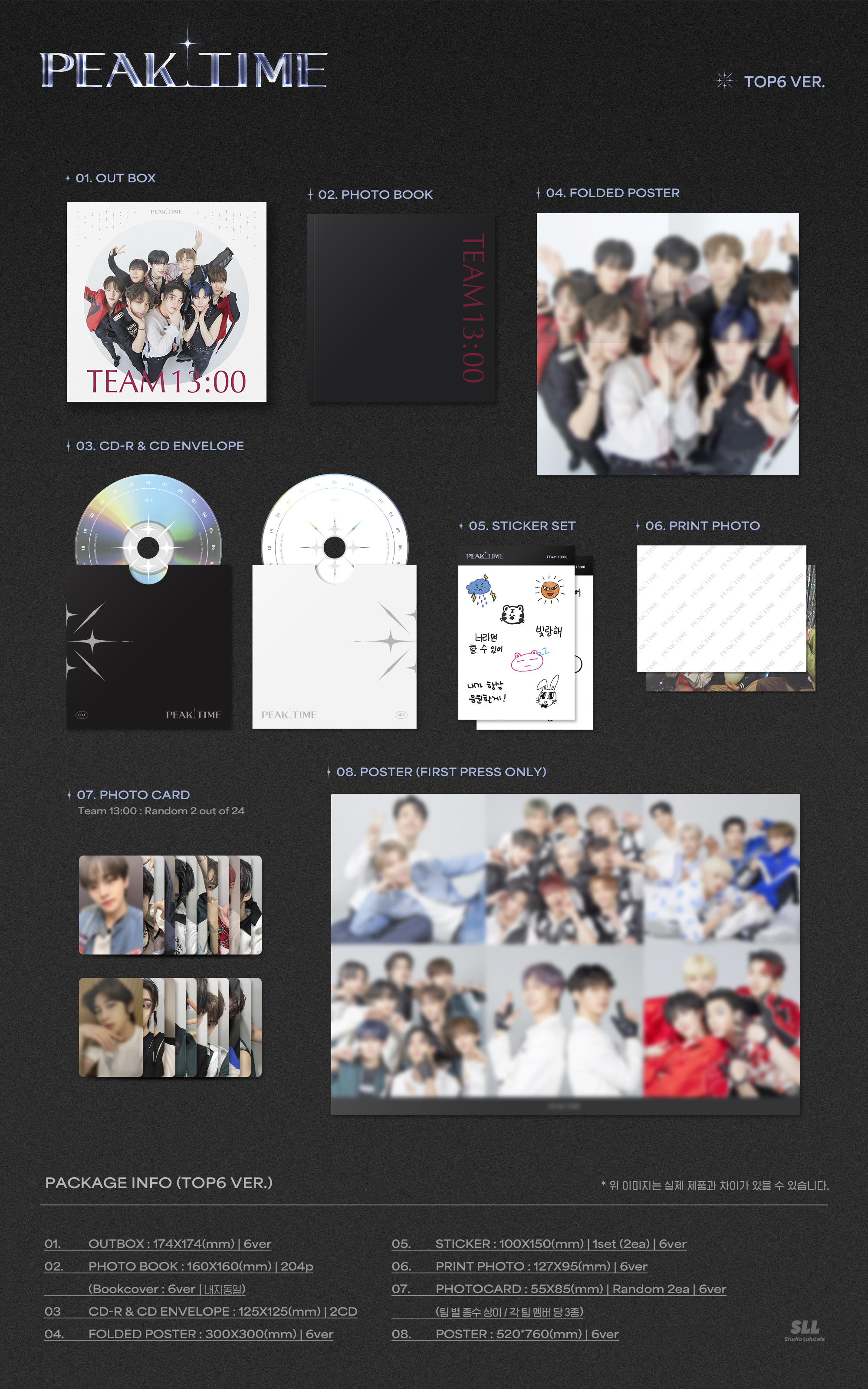 * 구성(1종 당): 자켓커버 1종 + 포토북 1종 + CDR2 + 스티커 1세트(2종) + 접지 포스터 1종 + TOP6 포스터 1종 + 포토카드 (24종 중 2종 랜덤) + 인화사진 1종