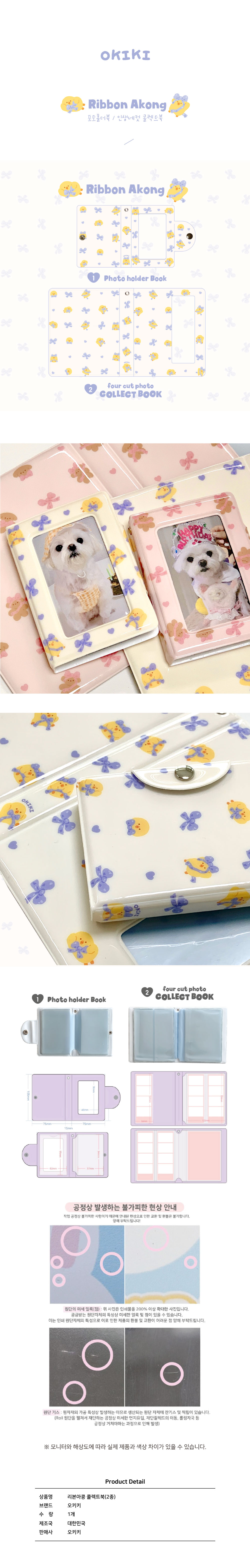 상세내역운영방침리뷰NOTICE* 아웃박스는 상품 보호를 위한 충격 방지용으로 제작되어 스크래치 및 구겨짐, 변색 등이 포장/배송 과정에서 생겨날 수 있고 이는 교환 사유가 될 수 없습니다.상품 정보 제공 고시상품명 : 오키키 포토홀더북_리본아콩원산지 : Korea제조/수입 : 오키키 오키키품질보증기준 : 관련법 및 소비자 분쟁 해결규정에 따름.AS 책임자 연락처 : Ktown4u, 02-552-0978