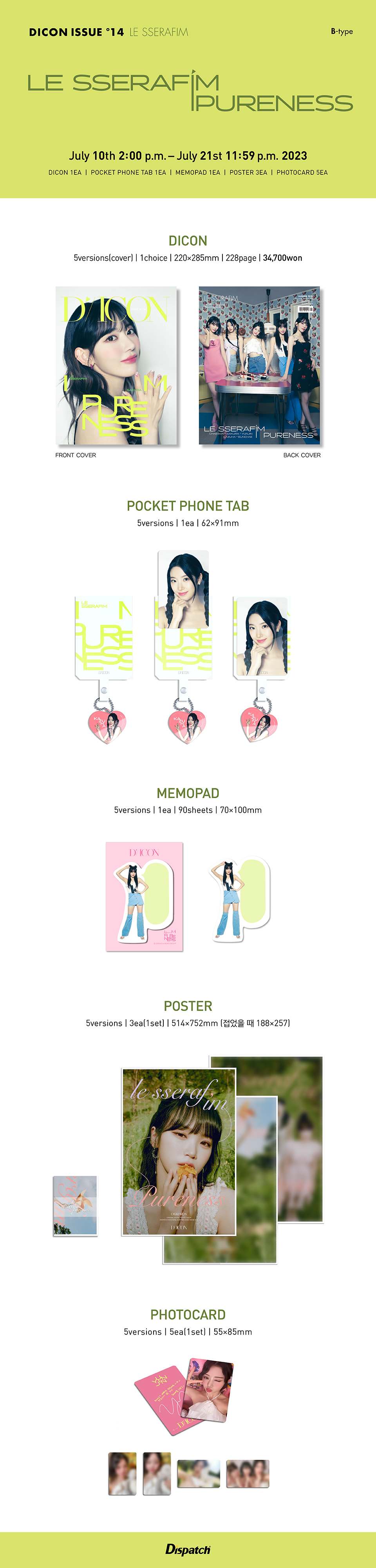 상세내역운영방침리뷰NOTICE* 아웃박스는 상품 보호를 위한 충격 방지용으로 제작되어 스크래치 및 구겨짐, 변색 등이 포장/배송 과정에서 생겨날 수 있고 이는 교환 사유가 될 수 없습니다.DICON ISSUE N°14 : LE SSERAFIM PURENESS B-type PART ① DICON 5versions(cover) | 1choice | 220×285mm | 228page | 재질 - paper ② POCKET PHONE TAB 5versions | 1ea | 62×91mm 재질 - pvc, acrylic ③ MEMOPAD 5versions | 1ea | 90sheets | 70×100mm 재질 - paper ④ POSTER 5versions | 3ea(1set) | 514×752mm (접었을 때 188×257) 재질 - paper ⑤ PHOTOCARD 5versions | 5ea(1set) | 55×85mm 재질 - paper INFORMATION 상품 정보 제공 고시상품명 : DICON ISSUE N°14 : LE SSERAFIM PURENESS B-type (YUNJIN)원산지 : Korea제조/수입 : (주)디스패치품질보증기준 : 관련법 및 소비자 분쟁 해결규정에 따름.AS 책임자 연락처 : Ktown4u, 02-552-0978