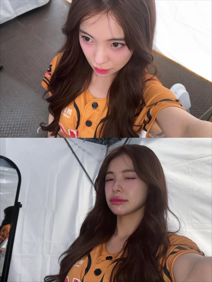 また、別カットでは腕の筋肉をアピールするポーズで茶目っ気たっぷりの魅力も披露。球場の控室と思われるテントの中でも、イ・ダヘ特有のラブリーな表情とエネルギーに溢れている。
