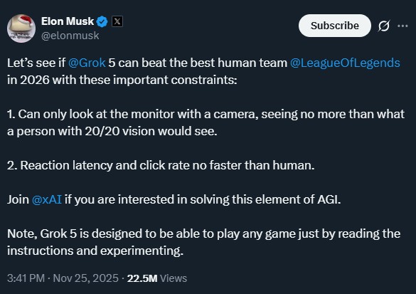 人間とAIの対決は、昨年11月25日(現地時間)、テスラCEOのイーロン・マスクが自身のX(旧Twitter)を通じて「グロック5がLoLの人間最強チームに勝てるか見てみよう」と公開対決を提案したことから始まった。イーロン・マスクは「グロック5」には「人間と同等の視力を持つカメラでモニターを見ること」「反応速度・クリック速度は人間より速くしないこと」など、複数の制約条件を設けると発表した。