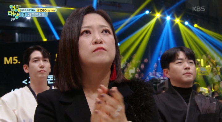 이에 후배 개그맨들은 모두 일어나 박수를 보냈으며 울컥한 김숙의 모습도 중계 카메라에 담겼다.