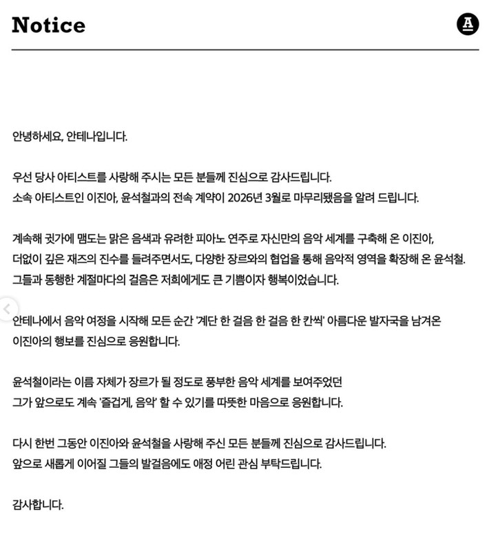 같은 날 이진아 역시 개인 계정을 통해 직접 입장을 밝혔다. 그는 "언제나 제게 든든한 그늘이 되어주었던 안테나와의 인연이 2026년 3월을 끝으로 마무리됐다"고 전하며 "11년이라는 긴 시간 동안 아낌없는 애정으로 함께해주신 희열 대표님과 회사 모든 분들께 진심으로 깊은 감사드린다"고 고마움을 표했다.