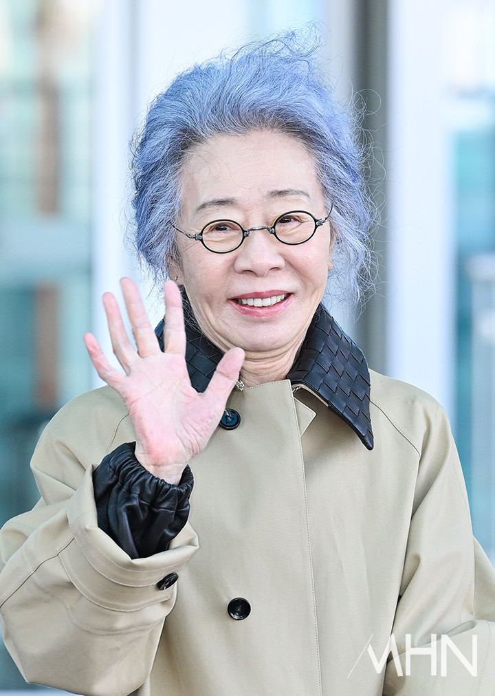 윤여정이 출국 전 포토타임을 갖고 있다.