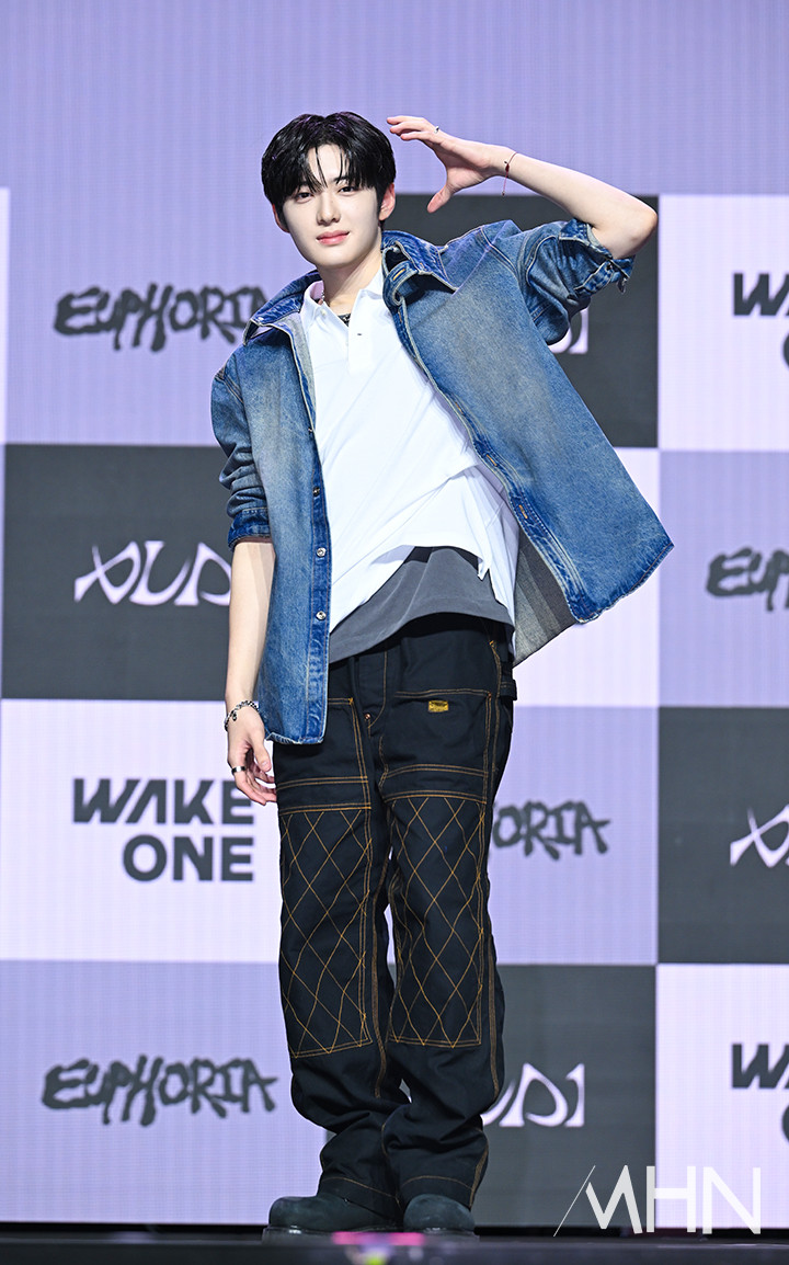 (MHN 이현지 기자) 그룹 알파드라이브원(ALPHA DRIVE ONE) 상현이 12일 오후 서울 용산구 블루스퀘어에서 진행된 미니 1집 ‘EUPHORIA’(유포리아) 발매 기념 쇼케이스에서 포토타임을 갖고 있다.