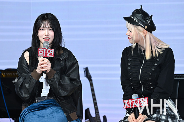 (MHN 이현지 기자) 여성 밴드 레이턴시(LATENCY) 희연이 18일 오후 서울 마포구 쇼킹케이팝센터에서 진행된 첫 미니앨범 '레이트 어클락'을 발매 기념 쇼케이스에서 질문에 답하고 있다.