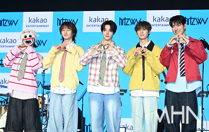 (MHN 이현지 기자) 그룹 하츠웨이브(hrtz.wav)가 8일 오후 서울 마포구 문화비축기지에서 진행된 첫 번째 미니앨범 'The First Wave' 발매 데뷔 기념 미디어 쇼케이스에서 포토타임을 갖고 있다.