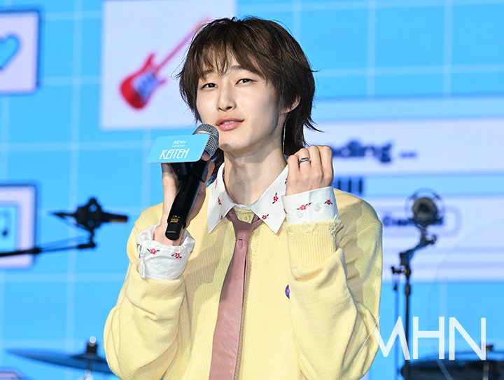 (MHN 이현지 기자) 그룹 하츠웨이브(hrtz.wav) 케이텐이 8일 오후 서울 마포구 문화비축기지에서 진행된 첫 번째 미니앨범 'The First Wave' 발매 데뷔 기념 미디어 쇼케이스에서 질문에 답하고 있다.