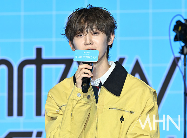 (MHN 이현지 기자) 그룹 하츠웨이브(hrtz.wav) 윤영준이 8일 오후 서울 마포구 문화비축기지에서 진행된 첫 번째 미니앨범 'The First Wave' 발매 데뷔 기념 미디어 쇼케이스에서 질문에 답하고 있다.